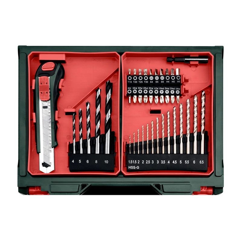 - КомплектацияКрючок для ношения на ремне, набор принадлежностей: 5 свёрл по дереву (4/5/6/8/10 мм), 14 свёрл HSS (1,5/1,5/2/2/2,5/3/3/3,5/4/4,5/5/5,5/6/6,5 мм), 20 отвёрточных бит длиной 25 мм (PH1/PH2/PH2/PH3/PZ1/PZ2/PZ2/PZ2/PZ3/H3/H4/H5/H6/T15/T20/T25/T30/S4/S5/S6), держатель бит (60 мм), нож с 2 запасными лезвиями