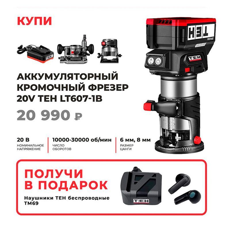 Аккумуляторный кромочный фрезер TEH LT607-1B — это ваш надёжный помощник для создания безупречных кромок. Он сочетает в себе свободу беспроводного инструмента с точностью и мощностью стационарного решения. Интуитивно понятная настройка глубины фрезерования, продуманная система пылеудаления и совместимость с широким парком фрез делают его незаменимым как для профессионального мебельщика, так и для требовательного мастера-любителя, ценящего качество и мобильность.