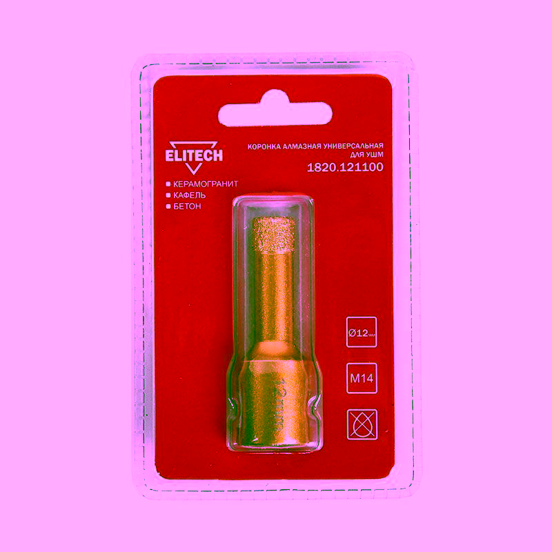 Алмазная коронка М14 Elitech 1820.121100 — это профессиональный инструмент для создания аккуратных сквозных отверстий в твёрдых материалах. Её ключевая особенность — универсальность и высокая эффективность при работе с керамогранитом, камнем, керамикой, бетоном и кирпичом. Инструмент предназначен для установки на угловую шлифовальную машину (болгарку) через переходник, что обеспечивает высокую скорость и точность сверления.