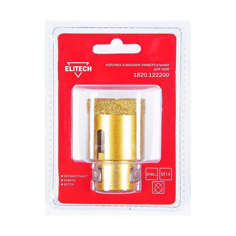 Алмазная коронка М14 Elitech 1820.122200 — это профессиональный инструмент для быстрого и точного сверления отверстий в твёрдых материалах. Она предназначена для установки на угловую шлифовальную машину (болгарку) с посадочным размером М14, что обеспечивает надёжное крепление и высокую производительность при работе.