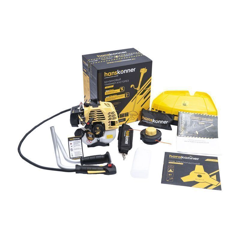 - КомплектацияТрехлопастной нож, канистра для топливной смеси, отвертка с торцевым ключом, шестигранный ключ (2 шт.), двухсторонний гаечный ключ, стяжка, сумка для инструментов