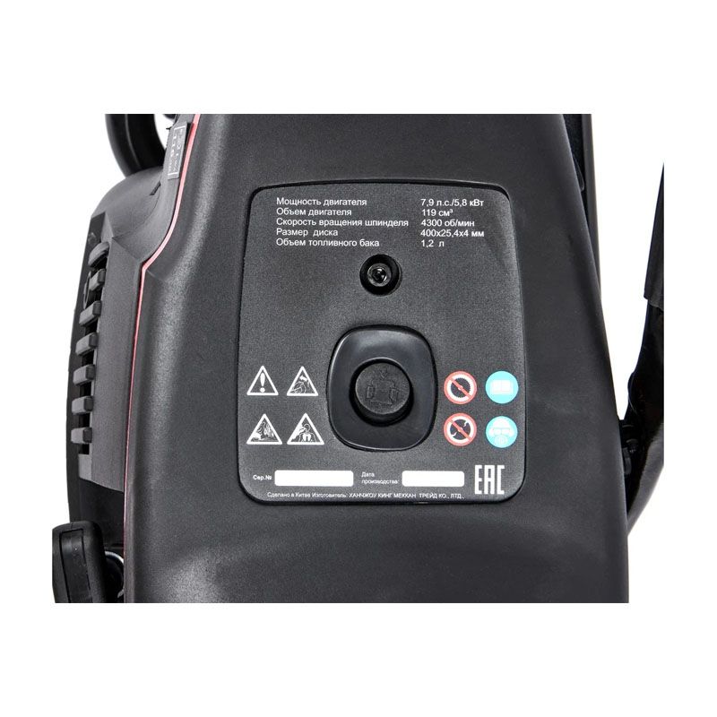 - Мощный и надёжный двигатель. Аппарат оснащён бензиновым двигателем объёмом 119 см³, который выдаёт 5.8 кВт мощности. Это обеспечивает стабильную работу под высокой нагрузкой и быстрое выполнение реза.