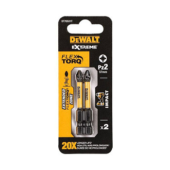 Размер бит Pozidriv Torsion DeWalt DT70531T — PZ2, что делает их универсальным решением для большинства задач. Длина изделия составляет 57 мм, что обеспечивает удобный доступ к крепежу. Хвостовик выполнен в виде одностороннего шестигранника, обеспечивающего надёжную фиксацию в держателе шуруповёрта или адаптере. В упаковке вы найдёте две биты, что удваивает ресурс для продолжительной работы.