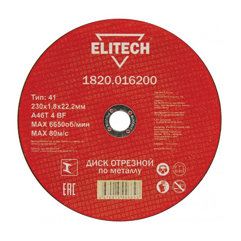 Технические параметры отрезного диска Элитек 1820.016200