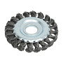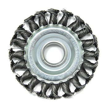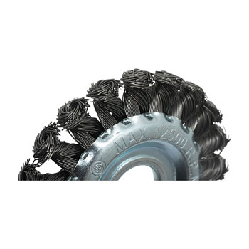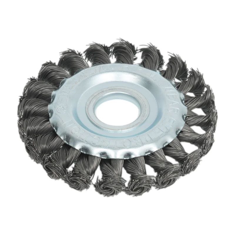 Щётка изготовлена из прочной кручёной стальной проволоки диаметром 0.5 мм, что обеспечивает высокую производительность и износостойкость. Кручение проволоки придаёт щетинкам дополнительную жёсткость и упругость, повышая эффективность очистки. Диаметр рабочей части составляет 100 мм, что является оптимальным размером для баланса между манёвренностью и площадью охвата. Крепление инструмента реализовано через посадочное отверстие 22.2 мм, что соответствует стандартному размеру вала большинства угловых шлифмашин (болгарок).
