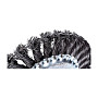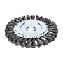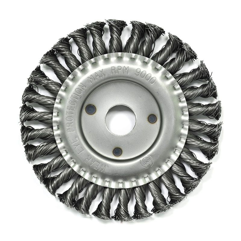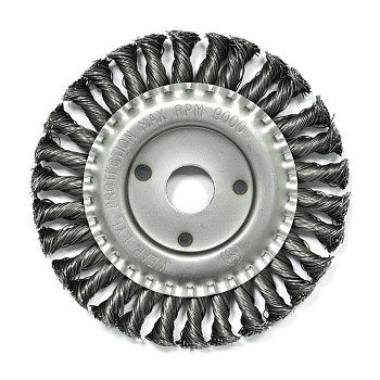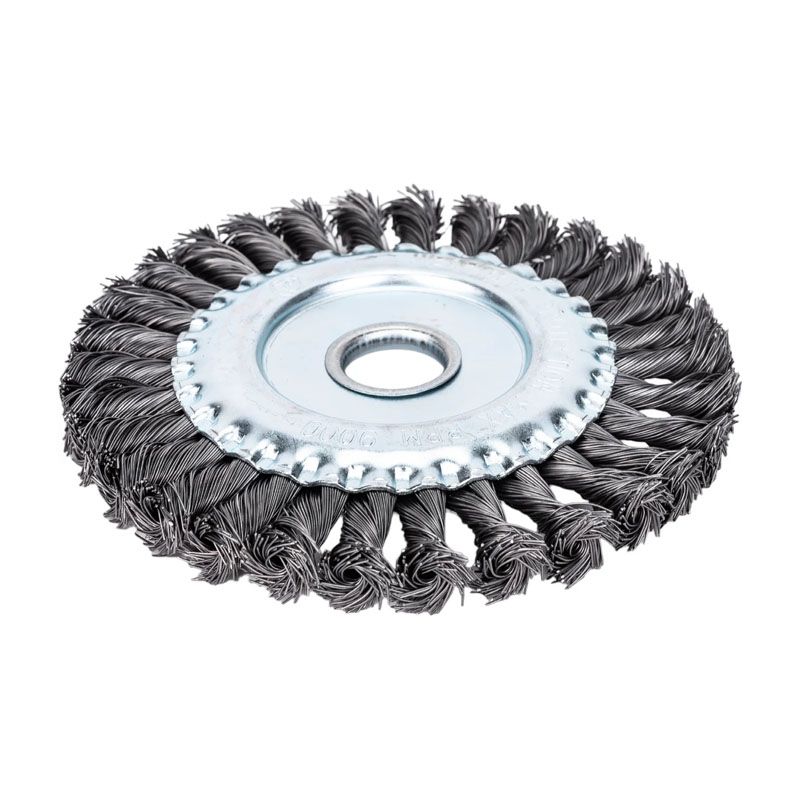 Щётка изготовлена из качественной стальной проволоки толщиной 0.5 мм, скрученной в прочные жгуты. Такая конструкция обеспечивает высокую производительность, износостойкость и минимальный разлёт щетины в процессе работы. Диаметр рабочей части составляет 150 мм, что позволяет охватывать значительную площадь за один проход. Для надёжного крепления на электроинструменте щётка оснащена посадочным отверстием стандартного размера 22.2 мм, что делает её совместимой с большинством угловых шлифовальных машин (болгарок).