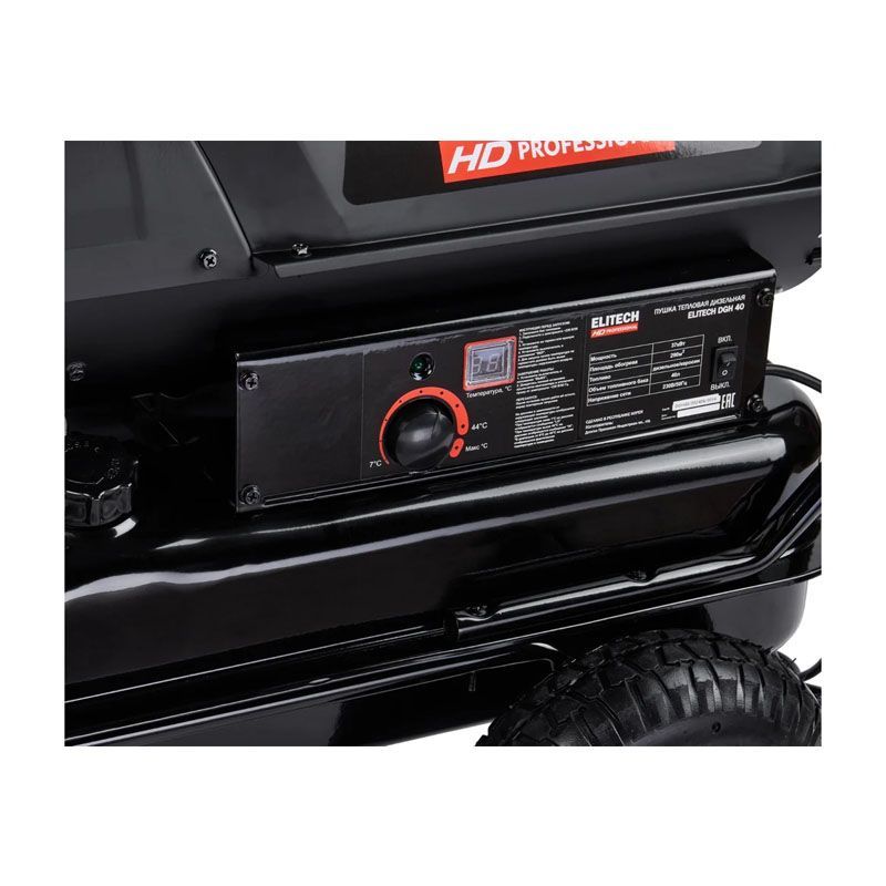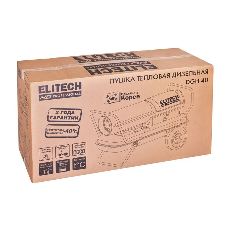 Таким образом, дизельная тепловая пушка Elitech DGH 40 представляет собой сбалансированное решение для профессионального отопления. Она сочетает в себе значительную мощность, мобильность и необходимый набор систем безопасности, делая её надежным помощником на любой стройплощадке, в производственном или складском помещении, где требуется быстрый и мощный тепловой поток.