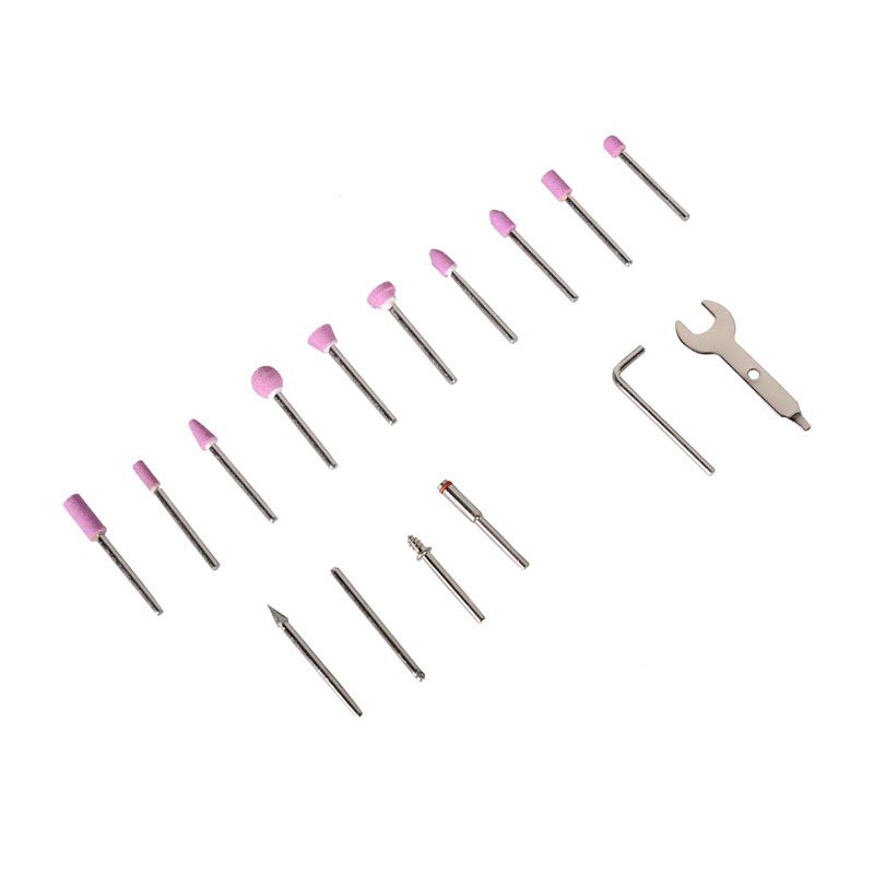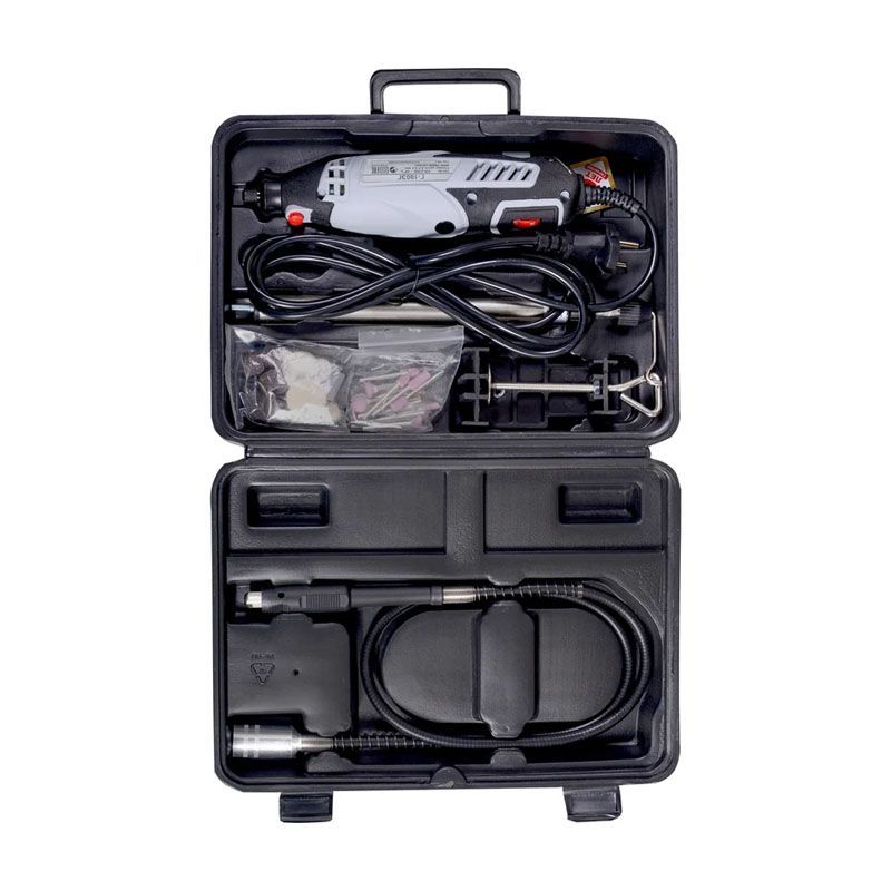 - КомплектацияНабор насадок, блокиратор шпинделя, гибкий вал, штатив со струбциной