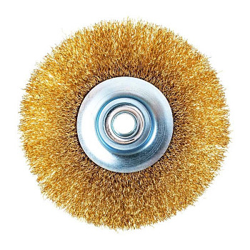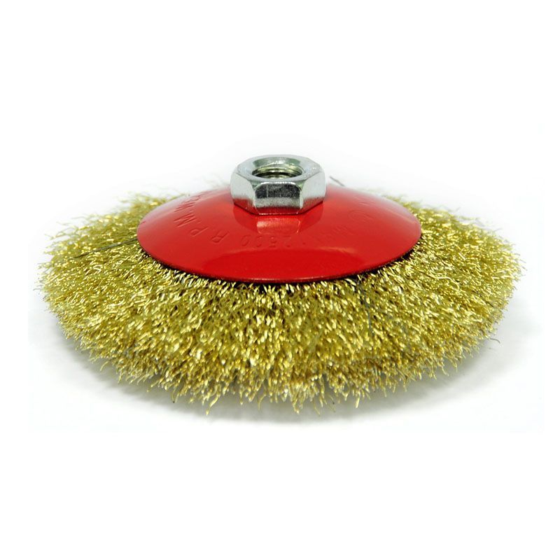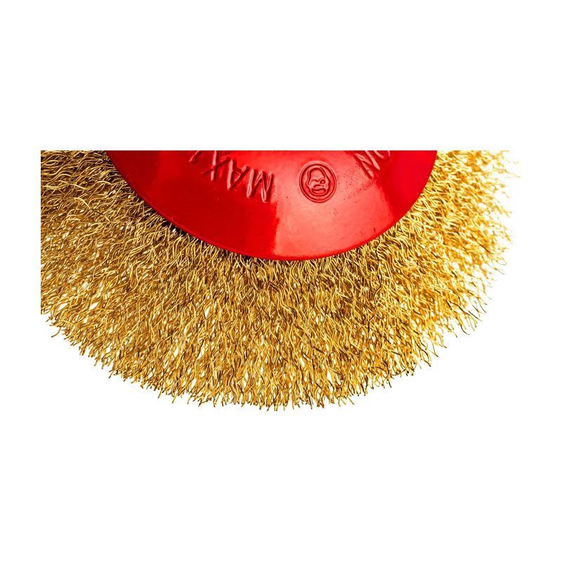 Рабочая часть щётки изготовлена из витой латунированной проволоки толщиной 0,35 мм. Латунирование обеспечивает защиту от коррозии и снижает искрообразование при работе, что повышает безопасность. Проволока надёжно закреплена в стальном основании, а конусная форма способствует агрессивному и в то же время контролируемому воздействию на обрабатываемую поверхность. Диаметр рабочей части составляет 125 мм, что обеспечивает оптимальный баланс между производительностью и удобством работы.