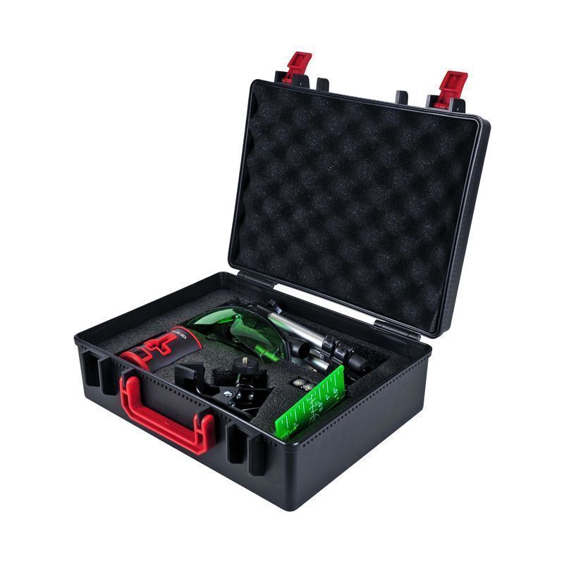 - В комплекте предусмотрены штатив для правильной установки нивелира, кейс и чехол-сумка для компактного хранения, а также очки и мишень.