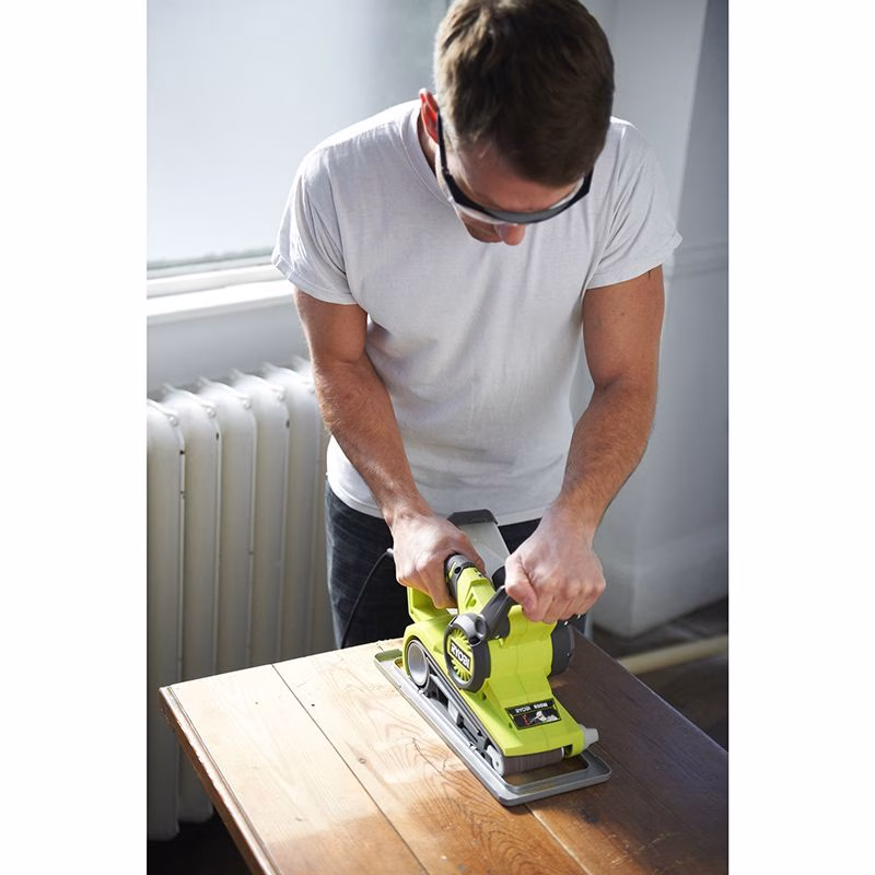 Ленточная шлифовальная машина RYOBI EBS800V предназначена для выполнения операций по выравниванию, зачистке и шлифованию. Она подходит для решения задач с разными материалами и хорошо справляется с обработкой больших поверхностей. Длина ленты у предлагаемого устройства имеет величину 533 мм, а ширина 76 мм. Что касается скорости, то она регулируется в диапазоне от 150 до 300 об/мин.