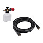 - Шланг 10 м длиной упрощает процесс промывки, расширяет простор для работы, позволяет чистить сильные загрязнения с большого расстояния, что в итоге даёт более качественный результат.