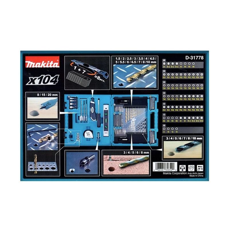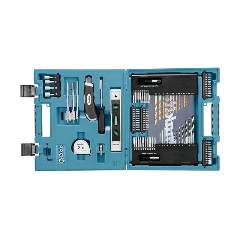 Данный набор инструмента состоит из пяти свёрл предназначенных для бетона, семи свёрл для древесины, четырнадцати свёрл для металла, измерителя диаметра, ручной отвёртки, двадцати четырех бит для отвёртки, одного магнитного держателя, зенкера, ножа, трёх плоских резцовых свёрл, позволяющей быстро и с удобством производить измерения расстояний рулетки, четырех торцовых насадок, двадцати шести насадок со шлицем, четырех ограничителей глубины для бит, восьми насадок для шурупов и винтов, одного держателя для насадок с зажимным патроном, одного уровня и одного шестигранного ключа.