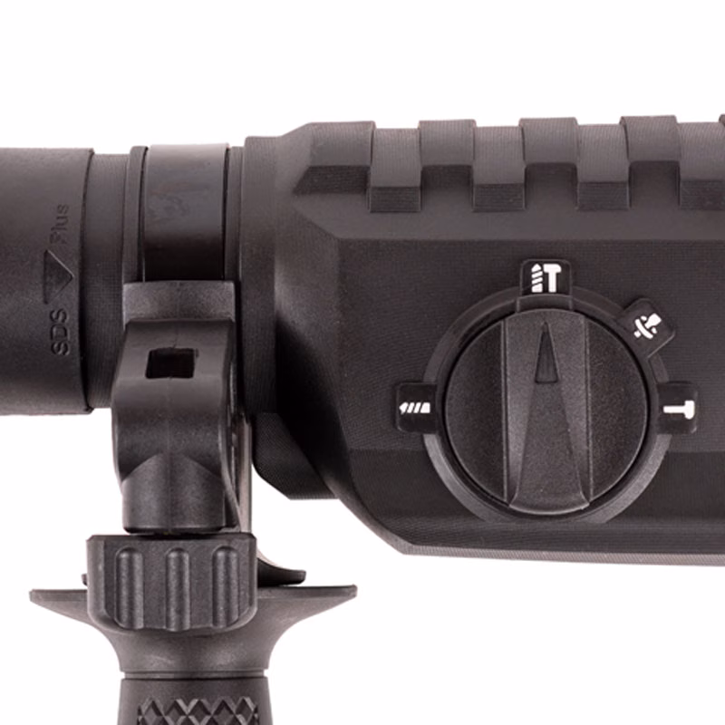 Перфоратор делает большие отверстия – до 32 мм (в зависимости от свойств материала). Он может работать с металлом, бетоном, деревом и не только. Вторая рукоять обеспечивает надёжный хват, за счёт чего дополнительно повышается точность операций. Благодаря патрону SDS-Plus оснастка меняется максимально просто, можно применять разные её виды.