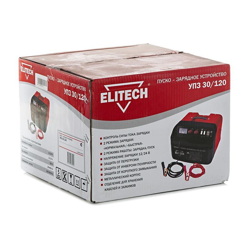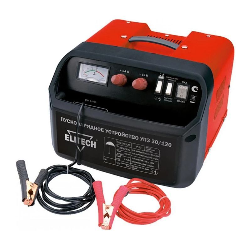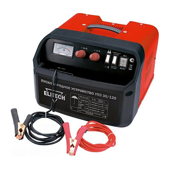 Пуско-зарядное устройство для автомобильного аккумулятора Элитек УПЗ 30/120 отличается удобством в эксплуатации. Оно обладает хорошо продуманной конструкцией и крайне легко управляется. В процессе использования с предлагаемым агрегатом не возникает никаких трудностей. Стоит заметить, что модель отлично подходит для зарядки батарей, предназначенных для самых разных транспортных средств, для генераторов и для различных типов оборудования. Кроме того, она рассчитана на запуск двигателей. Комплектуется этот прибор кабелями с зажимами.