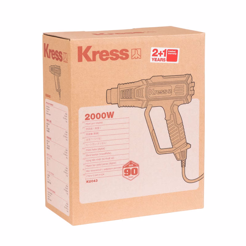 Строительный фен KRESS KU043 – новая модель известного бренда, который специализируется на производстве различного инструмента уже более 50 лет. Может выполнять целый ряд операций (ремонтных, монтажных, отделочных и др.). Это обусловлено высокой мощностью – 2000 Вт. В верхней части корпуса предусмотрен цифровой дисплей, предназначенный для точной регулировки температуры. Это важная функция, т. к. позволяет придерживаться рекомендаций производителей, строителей при работе с разными материалами. Вероятность испортить их практически нулевая.
