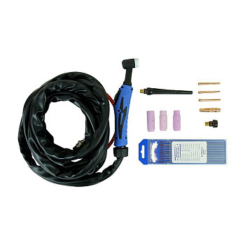 - КомплектацияЭлектрододержатель с кабелем, клемма «массы» с кабелем, TIG горелка, воздушный шланг, зажим шланга (2 шт.), короткий и длинный колпачки, цанги для электродов (3 шт.: 1.6, 2.0, 2.4 мм), сопло керамическое (3 шт.: №№ 7, 8, 9), вольфрамовые электроды (1 уп. - 10 шт.), молоток, ремень, твердосплавный карандаш