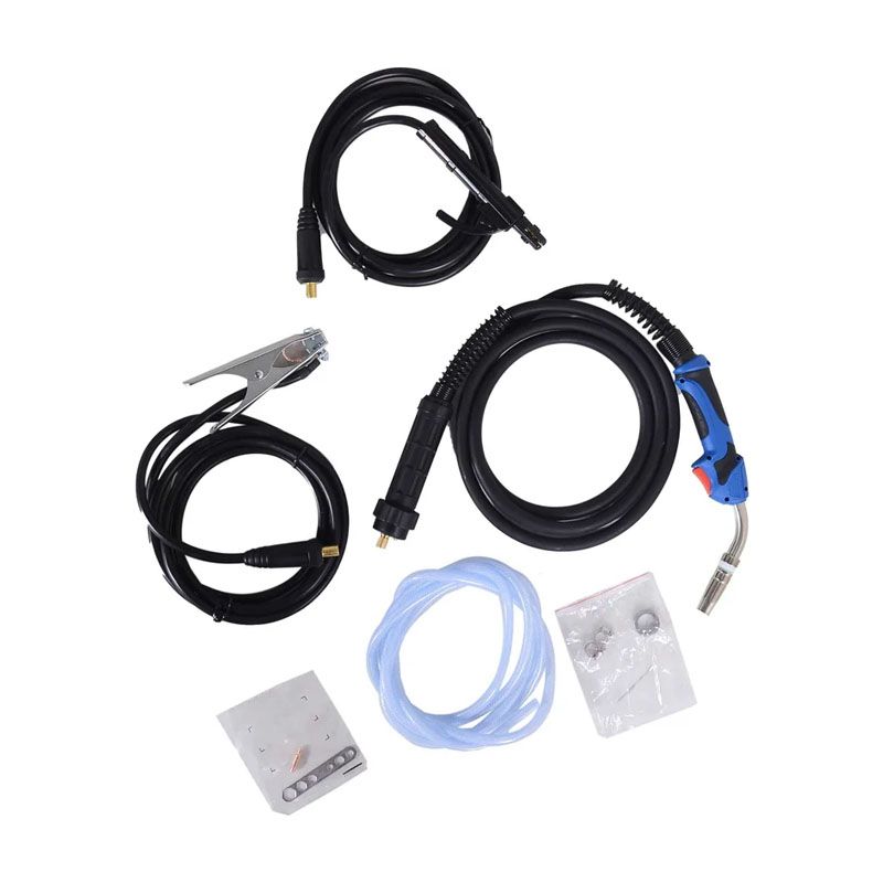 - КомплектацияКабель с клеммой заземления, кабель с горелкой, наконечники, газовый шланг (ø 8 мм), сварочный кабель, ролики