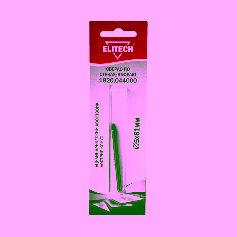 Диаметр сверла составляет 5 мм, а общая длина — 61 мм, что обеспечивает удобный захват и достаточный рабочий ход. Цилиндрический хвостовик гарантирует надёжную фиксацию в стандартном патроне дрели или шуруповёрта. Для корректной работы рекомендуется использовать инструмент на низких оборотах с охлаждением водой. Сверло по стеклу и керамике ELitech 1820.044000 поставляется поштучно, что удобно для подбора нужного диаметра.