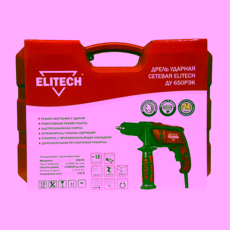 Ударная дрель Elitech ДУ 650РЭК является достаточно производительным комфортным в работе инструментом, который обладает стандартным для техники, выпущенной под этим брендом качеством. Чтобы купить данное устройство с ударным механизмом, сегодня не требуется тратить время на посещение торговых центров. Приобрести описываемый агрегат есть возможность, даже не выходя из собственного дома, оформив заказ на него в нашем интернет-магазине.